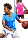 V-neck short sleeve. Relaxed, comfortable fit. Contrast angel wing panels on the back. 100% microfiber polyester pk maX. Inherent moisture wicking keeps you dry & comfortable. Treated with BodyFreshe to inhibit bacteria growth. Breathable, Easy Care. XS -2XL
